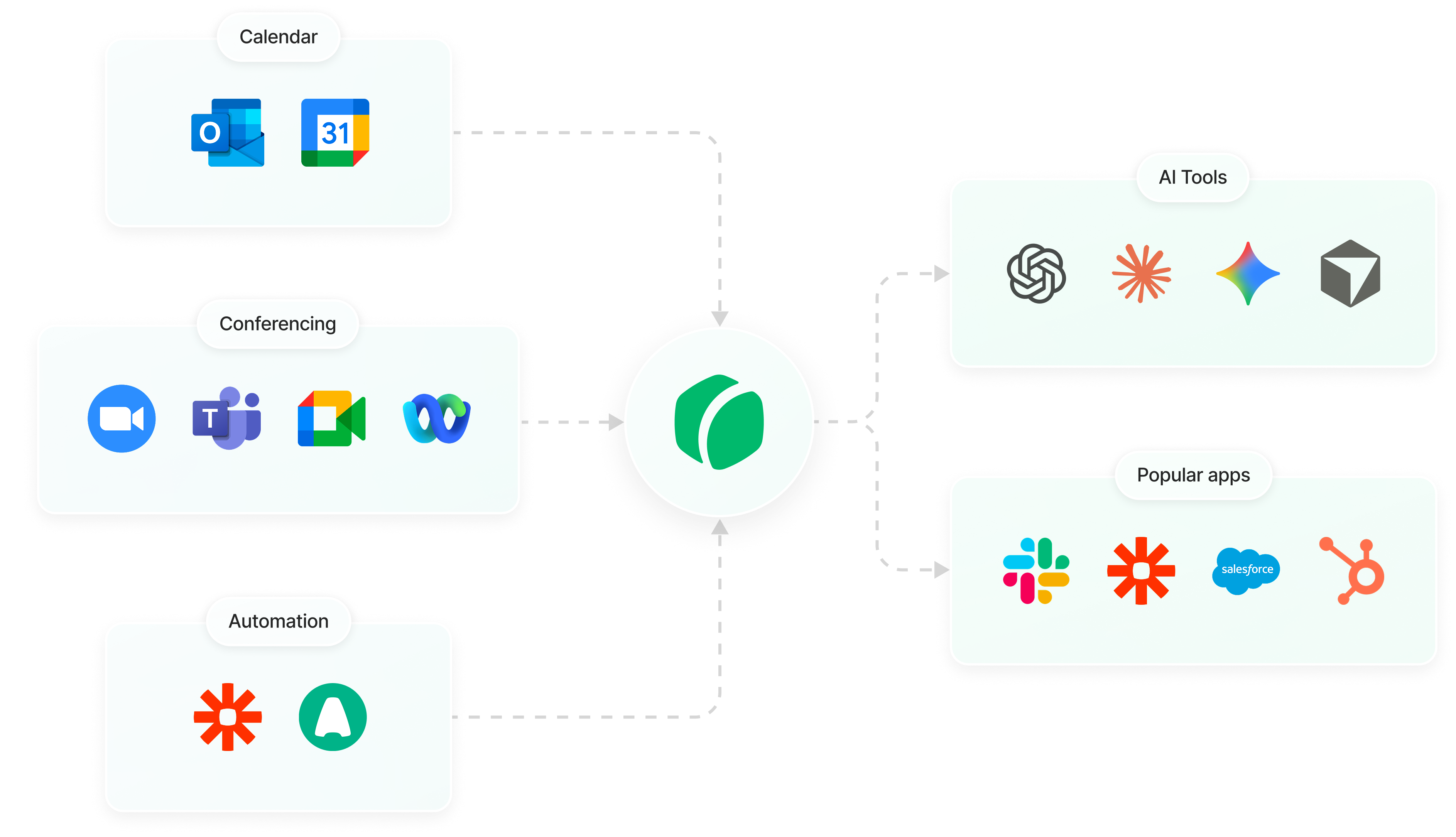 Integrations with Claude, ChatGPT, Slack, HubSpot, Zapier, API and more make it effortless to get your meeting data wherever you need it.